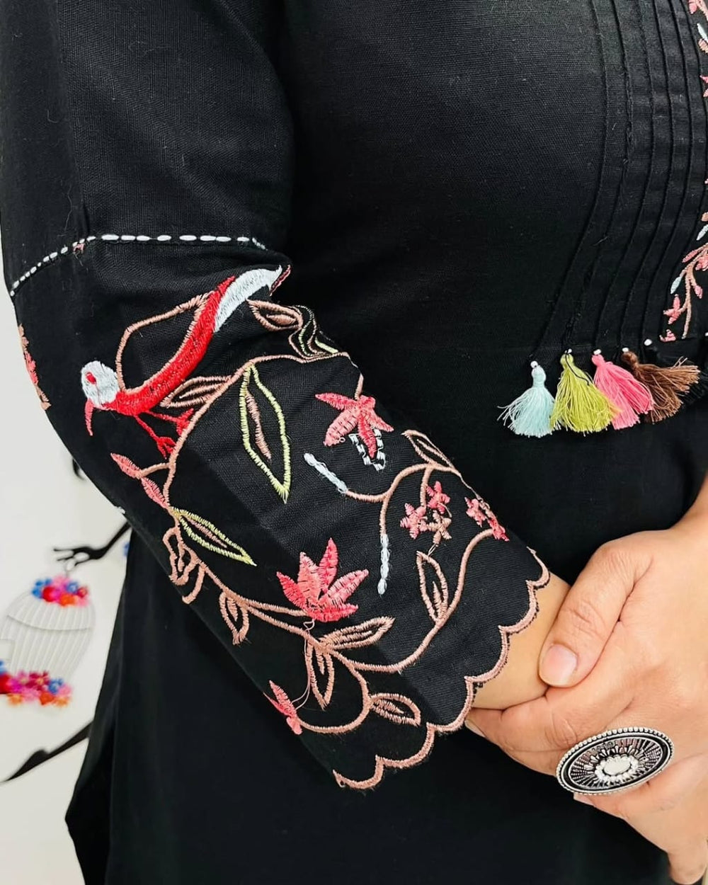 This Black Embroidered Cotton Kurta Set is a must-have for those who appreciate traditional style and comfort. Made from high-quality cotton, the intricate embroidery adds an elegant touch to the simple yet stylish design. The perfect combination of functionality and sophistication.
