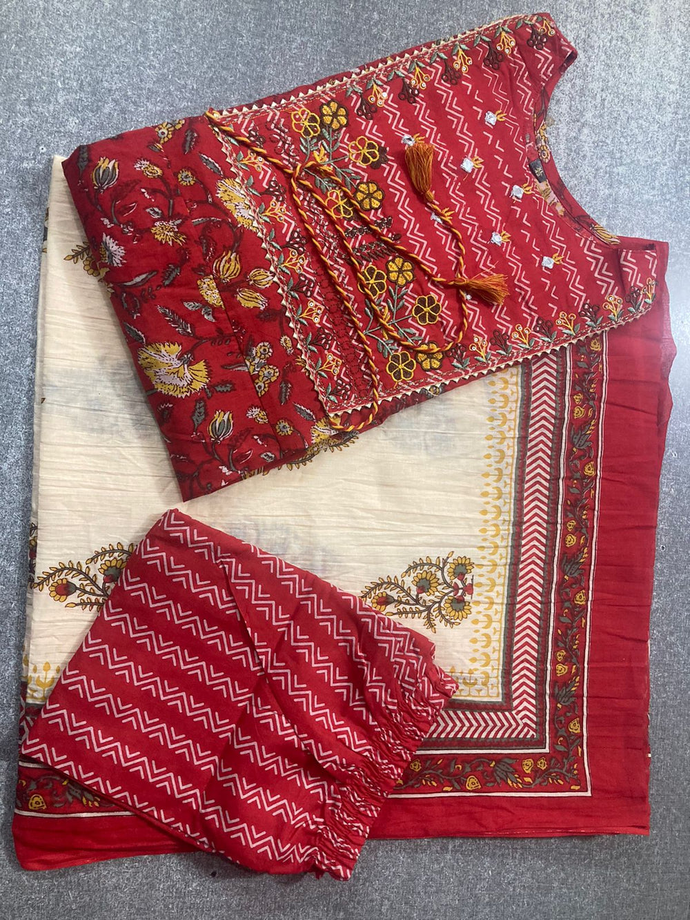 This elegant Anarkali set features a beautiful cotton floral print with delicate embroidered mirror work. The lightweight fabric offers comfort and style, making it perfect for any occasion. With its intricate details and high-quality material, this set is sure to elevate your wardrobe. Expertly crafted with precise attention to detail, this Anarkali set is a must-have for any fashion enthusiast.