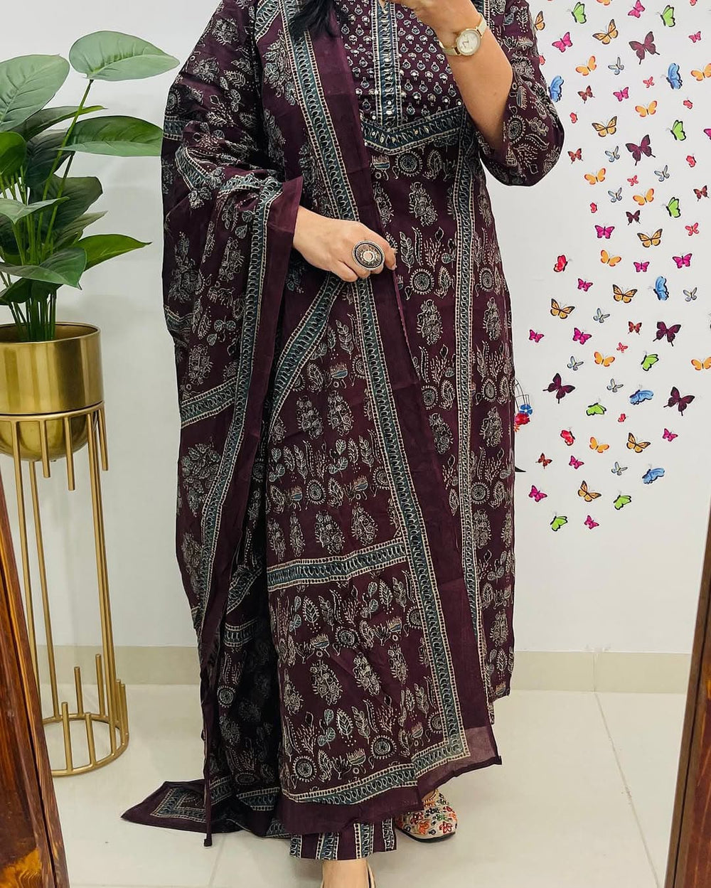 Expertly crafted from 100% Azrak cotton, this elegant wine kurta pant set with dupatta is the perfect addition to your wardrobe. Featuring a traditional and stylish design, this set offers both comfort and sophistication. The soft fabric and beautiful color make it the perfect choice for any occasion.