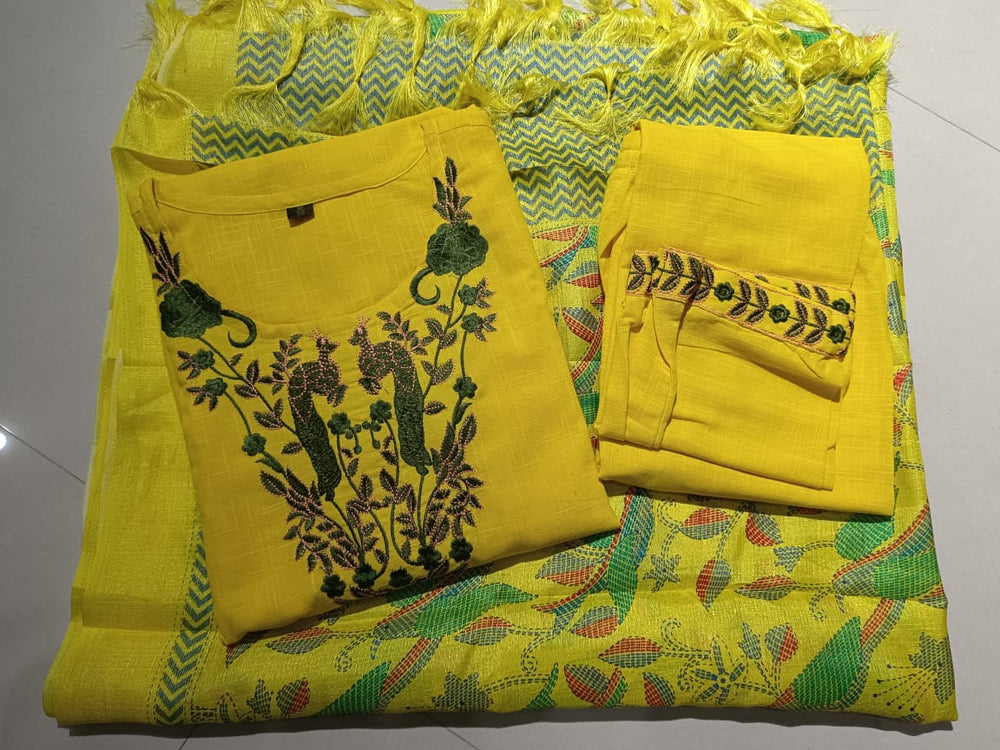 Elevate your style with our Embroidered Kurta Pant With Madhubani Dupatta Set. Adorned with intricate embroidery and a traditional Madhubani print dupatta, this set effortlessly combines elegance and cultural heritage. Made with high-quality materials for a comfortable fit, this set is sure to make a statement at any occasion.