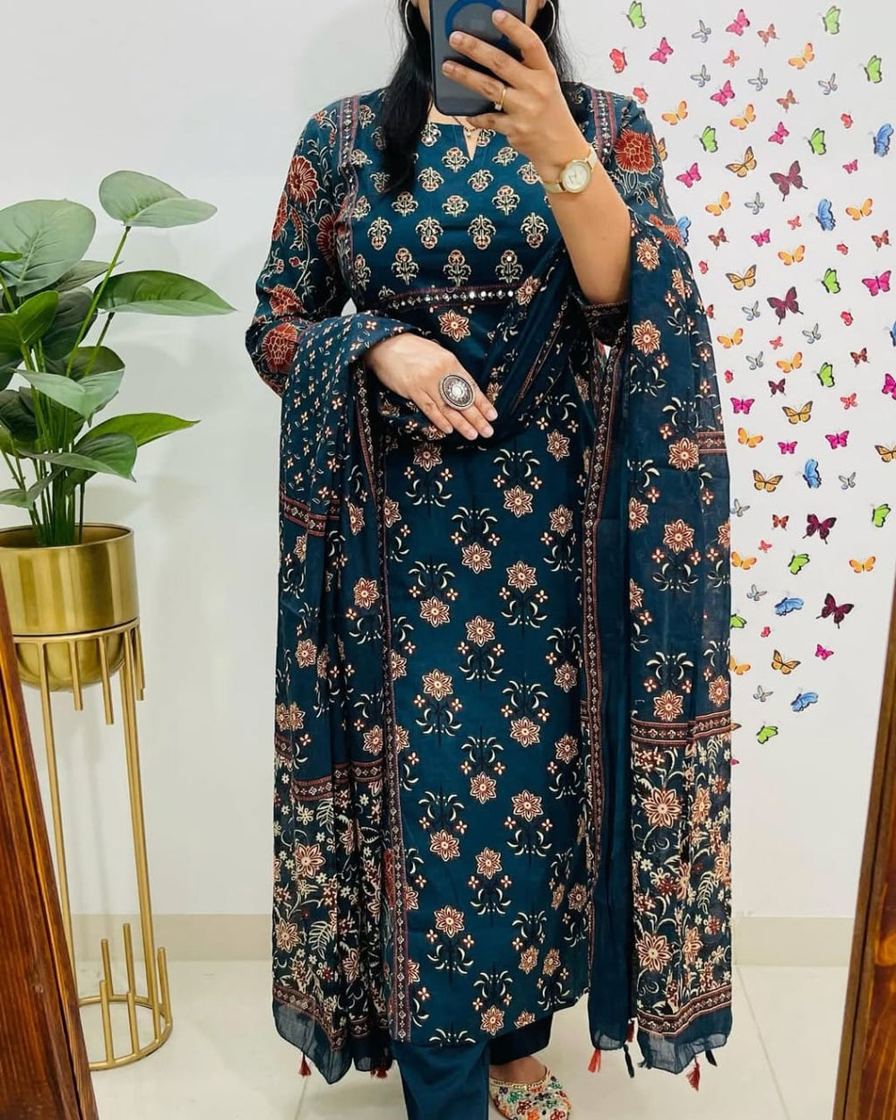 Experience the comfort and elegance of this Pure Fine Cotton Blue Suit Set. Crafted from high-quality cotton, it ensures breathability and softness, making it ideal for all-day wear. The rich olive green hue adds a sophisticated touch, perfect for both casual and formal occasions. This suit set combines traditional craftsmanship with modern style, offering durability and a refined look that enhances your wardrobe effortlessly.